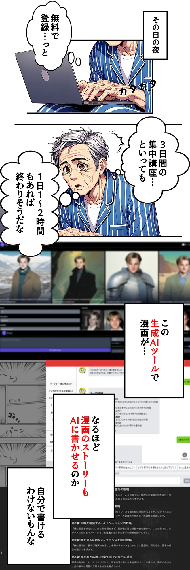 ほとんどそのまま使えるプロンプトがあるので、3日間の講座が終わった後、すぐにAI漫画を作ることができました。